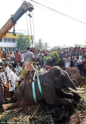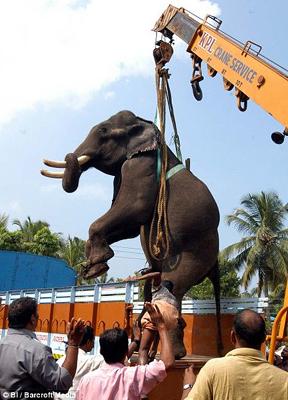 據英國《每日郵報》4月1日的報道,周二,印度喀拉拉邦一頭公象在交通繁忙的公路上被一輛卡車撞到,兩條后腿骨折和背部受傷,獸醫不得不動用起重機來搬運這個“龐然大物”。據報道,這頭大象高9英尺(約2.7米),重達6噸,剛剛從附近的一家印度教寺廟逃出。在事發現場,數百名觀眾正在觀看獸醫如何救治受傷的大象和如何將它搬離現場。一名獸醫表示,這頭大象體型龐大,情緒極不穩定。不過,它此前一直生活在附近人來人往的寺廟,所以對人并不十分恐懼。在對大象做過全面評估后,他們決定從附近的建筑工地上征用一輛起重機,將這頭大象吊到卡車上,將它運往一家獸醫醫院。據悉,搬運工作進展得十分順利。不過,令人可悲的是,盡管獸醫在努力救治這頭大象,但由于它的傷勢過于嚴重,于當天晚間死去。