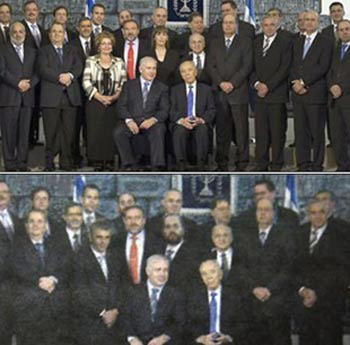近日,以色列新內(nèi)閣剛剛舉行了就職儀式。不過(guò)兩家猶太極端主義報(bào)紙卻打著“與傳統(tǒng)宗教信仰的信條相契合”的幌子,偷換了以色列新內(nèi)閣就職儀式合影照中兩位女性官員的形象,取而代之的是兩位不知名的男士。