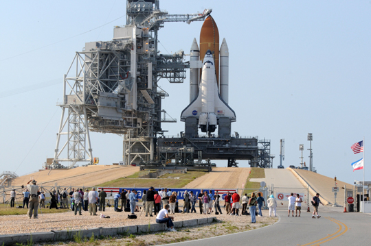 當地時間5月10日,在美國佛羅里達州肯尼迪航天中心,“阿特蘭蒂斯”號航天飛機在發射臺上等待發射。