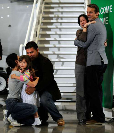 李承恩與丈夫邁克爾-薩爾達(dá)杰和四歲女兒漢納擁抱時(shí),流下喜悅的眼淚。凌志美與丈夫伊恩-克萊頓擁抱,其它家人則擠在他們周?chē),激?dòng)得流淚。