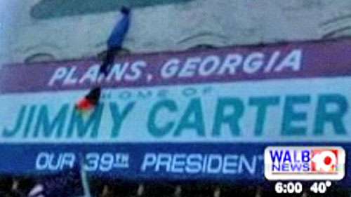 據香港大公網報道,那是一個巨大的黑色假人,外貌酷似奧巴馬,頸部纏著一條繩,被人吊在平原鎮大街一幢建筑物外面。那座建筑物的外墻掛了一幅巨型橫額,印上“佐治亞州平原鎮,我們的第三十九任總統卡特的故鄉”的字句。