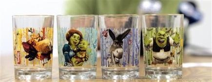 這種玻璃杯1個售價為2美元,杯身印有電影《怪物史萊克4》中的角色形象,一共有4款。杯子一杯可盛16盎司飲料。