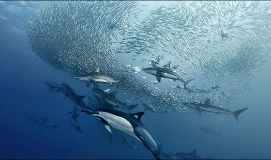 這群從南非海域向更暖和的印度洋遷徙的沙丁魚不僅要面對(duì)能以每小時(shí)40海里行進(jìn)的鯊魚和海豚的追逐,還要防止陰險(xiǎn)的塘鵝從空中的偷襲。
