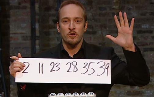 英國(guó)電視臺(tái)現(xiàn)場(chǎng)直播了當(dāng)期彩票的開(kāi)獎(jiǎng)過(guò)程,由機(jī)器隨機(jī)選擇箱子中的球。而在另一個(gè)演播室,放置了一臺(tái)電視播放開(kāi)獎(jiǎng)過(guò)程。這位身處另一演播室的神秘“幻術(shù)師”在結(jié)果出來(lái)之前,就背對(duì)電視寫下了一組數(shù)字,分別是2、11、23、28、35和39。結(jié)果證實(shí),他所預(yù)測(cè)的數(shù)字與中獎(jiǎng)結(jié)果完全一致,令人瞠目結(jié)舌。