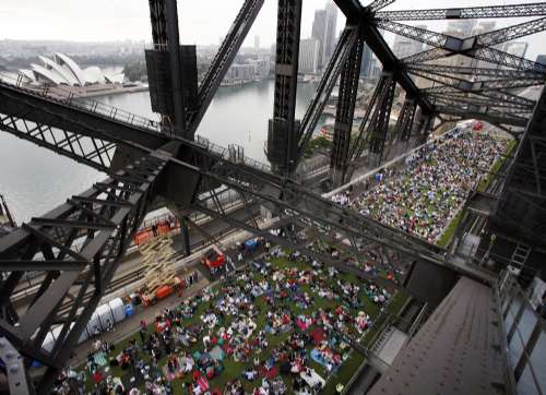 據香港大公網報道,當第一縷陽光照射在悉尼港大橋上時,等待已久的人們井然有序地開始從北岸上橋。他們有的全家出動,有的呼朋結伴,有的老人甚至坐著輪椅趕來。在大橋的入口處,一些音樂家在演奏,為早餐會助興。組織者還特地從農場運過來十多頭奶牛,為來賓現場擠牛奶。