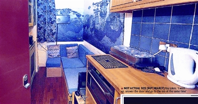 家中雖小,但家具和設備一應俱全,有沙發床、衣柜、廚具等等,狹小的洗手間被巴克改成了迷你浴室,不用洗澡時,這個浴室就是一個衣柜,可以掛衣服。開放式廚房也設在客廳內,與沙發床緊貼。