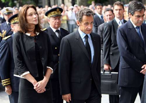 薩科齊(中)與夫人布魯尼(左)和總理菲永(右)出席悼念儀式。