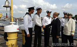 普京參觀了駕駛帆船的過程,同船員合影,并且與水手進行了交談。
