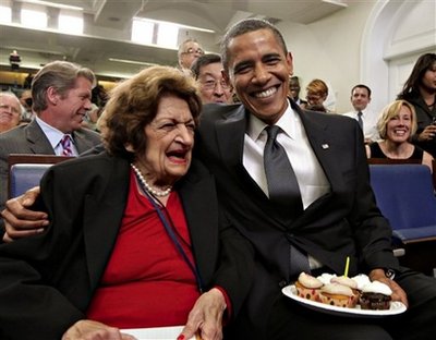 中新網(wǎng)8月5日電 8月4日是美國(guó)總統(tǒng)奧巴馬48歲生日。他于下午白宮舉行例行記者會(huì)時(shí),意外來到新聞簡(jiǎn)報(bào)室,手上捧著一盤蛋糕,送給也于當(dāng)天過生日的最資深記者海倫-湯瑪斯。