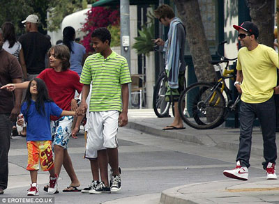 據報道,25歲的哈提穿著黃色的T恤、牛仔褲,同12歲的Prince和留了長發的7歲的Blanket出現在加州圣莫尼卡街頭,他們正要一同去書店。和他們在一起的還有一個朋友和一個負責照看他們的人,一行人看上去興致勃勃,心情不錯。