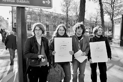 反對派社會黨青年團不滿讓-薩科齊子憑父貴,4名成員昨日游行前往愛麗舍宮,拉橫幅要求薩科齊收養失業年輕人。