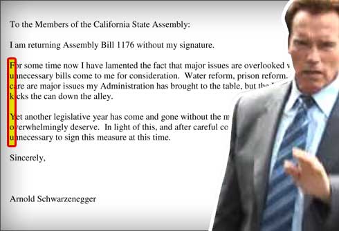 然而,施瓦辛格的過人“幽默感”與反擊方式不僅止步于此。他在否決這項法案的特別咨文中,竟以“藏頭詩”的方式狠狠羞辱了政敵阿米阿諾。從信的正文第二自然段起,將每行左邊第一個字母挑出來,豎著念,就能拼成兩個單詞,而這兩個單詞可謂是全球最廣為人知、也堪稱美國“國罵”的不雅詞匯。可見這位曾經對著萬千觀眾大秀肌肉的好萊塢猛男玩起文字游戲來,一點也不含糊。