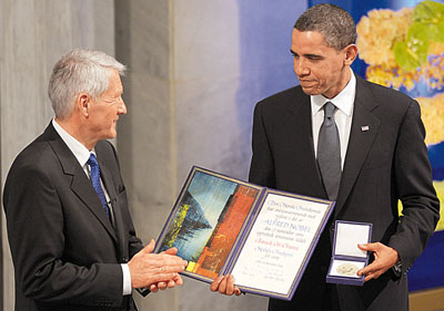 奧巴馬日間拜訪挪威諾貝爾研究所,簽署紀念冊。他贊揚歷屆得獎人為“無聲的人發聲”,又特別凝視美國黑人民權領袖馬丁路德金的肖像,表示和平獎增加了路德金的世界地位,鼓舞了他的國內運動。