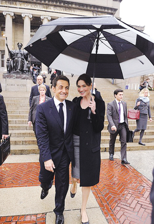法國娛樂雜志的網站用頭條報道薩科齊夫婦到訪紐約,紐約給了薩科齊在自己的國家,也好久沒有感受到的關注,哥倫比亞大學學生的熱情,更讓薩科齊心情大好,他放棄事先準備好的講稿,改說肺腑之言。從薩科齊在哥倫比亞大學演講的安排,就可以看得出來法國人是多么注重外在美。薩科齊在哥倫比亞演講的白色講臺和通往講臺的淺灰色地毯,都是他自己從法國帶去的。薩科齊穿深藍西裝、打黑領帶,布呂尼穿黑上衣、配灰裙子,加上黑白相間的花傘,看得出來是經過刻意搭配,和地毯與講臺呼應。
