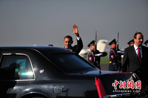 奧巴馬總統(tǒng)于當?shù)貢r間8日上午9時30分(北京時間8日15時30分)步下降落在布拉格魯濟涅老機場的“空軍一號”專機舷梯。簽字儀式在兩個半小時后舉行。