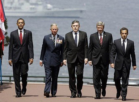 薩科齊與前來法國參加諾曼底登陸紀(jì)念活動的各國政要一道走來,身高差距明顯。
