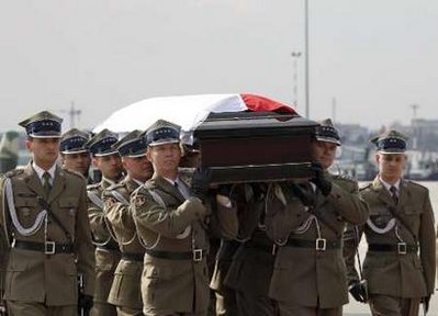 在靈柩被送入機艙時,波蘭和俄羅斯的儀仗隊舉行了簡短而莊重的紀念儀式。