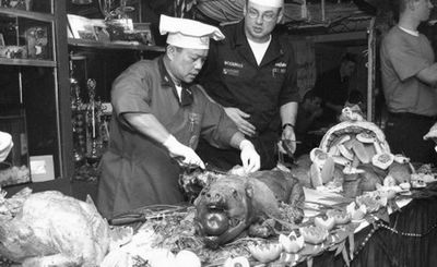 海軍官兵還特別期待一些能飽口福的“特殊的日子”,比如在生日會、少數族裔晚宴、星期天午餐會、“墨西哥煎玉米餅餐會”和“冰激凌聯誼會”上總能吃到許多可口的特色食物。此外,每天早上廚房還會烤出成箱的餅干送往各部門,這也很受士兵們喜愛。米爾斯和法度透露,航母上士兵們最喜歡的是一道名為“海浪和草地”(龍蝦和烤牛肉,作者注)的套餐,不過這種奢侈品一個月只能提供一兩次。此外,“斯坦尼斯”號的招牌菜“龍蝦天婦羅”也同樣受歡迎。