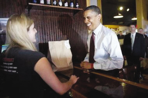 據法新社消息,美國總統奧巴馬13日在紐約州布法羅時,突然造訪當地一家以出售“水牛城辣雞翅”而聞名的小吃店。一名女店員由于見到奧巴馬過度緊張和興奮,竟一時口誤,用了極其不雅的詞匯稱贊奧巴馬是“帥哥”。