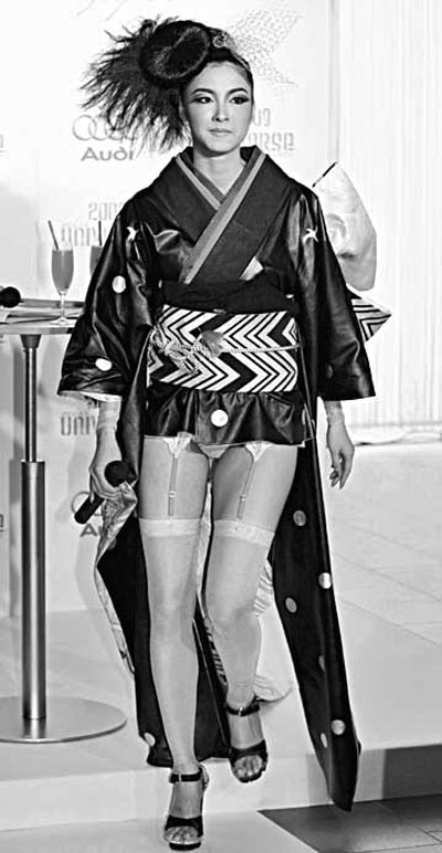據香港《文匯報》報道,25歲的宮阪幾個月前在東京展示“改良版”戰衣。和服設計大膽,以黑皮革制造,上半身非常密實,但下半身的黑布帶一揭開,春光無限,不但露出桃紅色內褲,還有同色絲襪和襪帶。