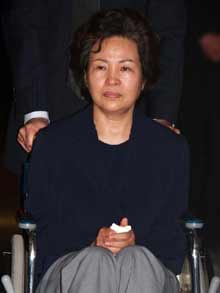在25日盧武鉉入殮儀式之前,權良淑女士眼中滿含淚水,從慶尚南道金海市峰下村坐輪椅前往了靈堂。