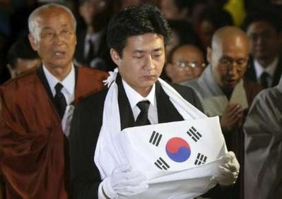 中新網5月30日電 韓國前總統盧武鉉的骨灰30日運抵故鄉的鄉村,暫時被安置在烽火山凈土院的佛堂中。迎魂的返魂祭將在凈土院院中祭壇進行。