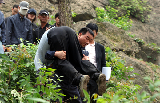 據韓國《朝鮮日報》報道,慶南警察廳2日在慶尚南道金海市峰下村后山進行了有關盧武鉉逝世的現場驗證,警衛戴著帽子和口罩默默地再現了當時的狀況。