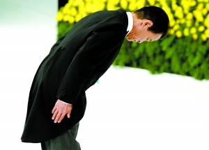 15日,日本首相麻生太郎在東京日本武道館舉行的“全國戰歿者追悼儀式”上向“全國戰歿者靈位”鞠躬。新華社發