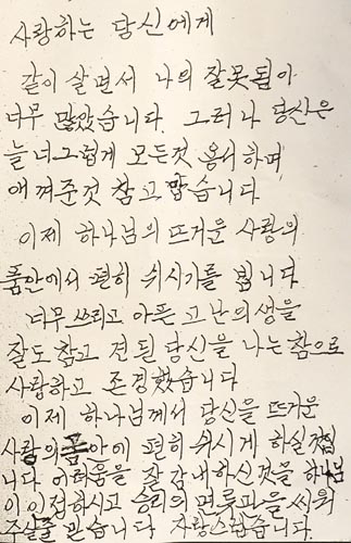 信中稱:“在一起生活的過程中我犯下的錯誤太多了。但你總是寬容地原諒一切過錯,還很愛惜我,真的很感謝你。希望今后能在上帝溫暖的愛的懷抱中安息。你挺過了極其苦難和悲傷的人生,我真的很愛、很尊敬你。你的妻子李姬鎬。”