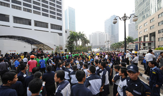 在首都雅加達,群眾紛紛涌上街頭躲避,上班族也從辦公大樓中相繼撤離。
