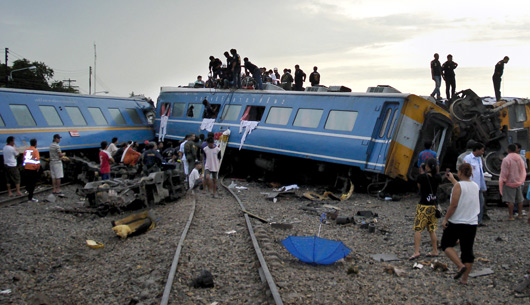 據此間泰國民族網站報道,事故今天早上四點四十五分發生在華欣縣的號陶站,事故發生時,這輛有十六節車廂的火車至少有六個車廂出軌,并當場造成七名女旅客死亡,逾百名旅客受傷。