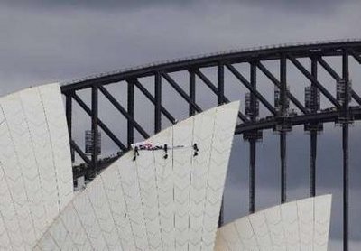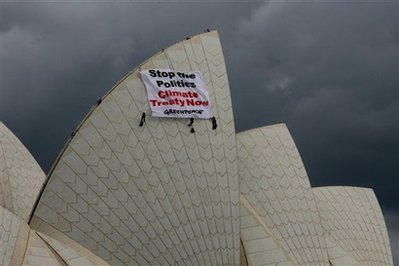 據報道,在哥本哈根召開的氣候峰會上,發達國家和發展中國家兩大陣營之間仍在僵持,各界對峰會結果的悲觀情緒彌漫會場。15日,5名綠色和平組織成員抓著繩索爬上了悉尼歌劇院,并拉開一個100平米大的條幅,上面寫著“不要再玩政治——立刻達成氣候協議”。事后,這5人被警方逮捕。