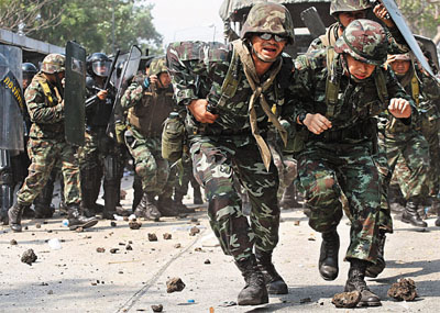 中新網(wǎng)4月10日電 據(jù)香港《文匯報(bào)》10日報(bào)道,泰國反政府“紅衫軍”繼續(xù)不理會緊急狀態(tài)令,昨日發(fā)起大游行,沖擊被禁播的電視臺,政府遂于連場示威中首次動(dòng)武,軍警施放催淚彈及水炮,但仍然無果,最后棄械撤退,紅衫軍成功占領(lǐng)電視臺。傍晚多個(gè)商場的顧客及員工被促離開,傳警方部署在6個(gè)地點(diǎn)拘捕示威領(lǐng)袖,并在一個(gè)集會地點(diǎn)清場。