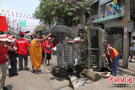 泰國10日晚的血腥沖突造成至少21人喪生,874人受傷。這是自從1992年有48人在一次反軍方抗議中被殺以來,曼谷最嚴重的暴力行為。傳媒透露,下令驅散“紅衫軍”的是陸軍第二把交椅、陸軍副司令帕拉育,他還表示會承擔一切后果。暴力沖突后,軍隊撤后以示節制,并且要求“紅衫軍”也后退,因此11日深夜,曼谷出現一種非正式的;馉顟B。