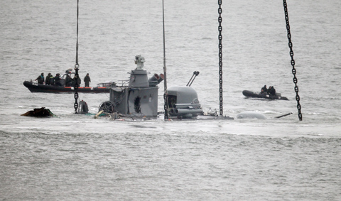海軍方面的一位有關(guān)負(fù)責(zé)人表示:“風(fēng)浪很大,再加上出現(xiàn)‘漲潮’現(xiàn)象,水流速度非常快,因此周末之前很難完成打撈作業(yè)。”負(fù)責(zé)打撈作業(yè)的民間企業(yè)的一位有關(guān)負(fù)責(zé)人表示:“如果現(xiàn)在繼續(xù)進(jìn)行打撈作業(yè),鐵鏈可能會(huì)破入船體的脆弱部分。能承受鐵鏈力量的船體耐用材料已經(jīng)流失。”