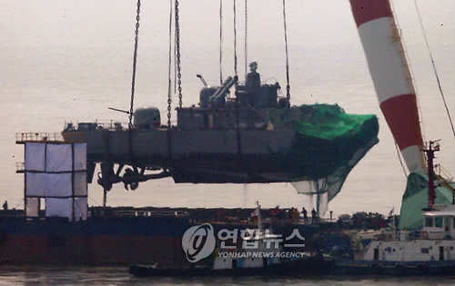 中新網4月15日電 據韓聯社報道,韓國“天安”艦艦尾的打撈工作15日進行。由韓國軍方和民間組成的打撈工作組,15日下午1時14分利用大型起重機,將“天安”艦船尾打撈出水后,成功放置在駁船上。