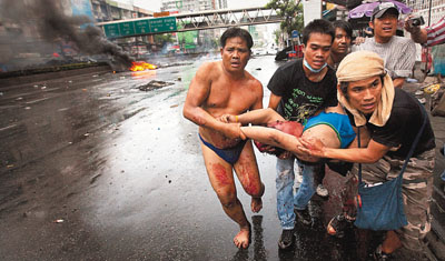 泰國政府表示,會繼續軍事鎮壓紅衫軍,宣布今明兩天為假期,讓民眾留在家中。曼谷市長素坤攀說,考慮到學生和教師安全,曼谷學校新學期開學日從今日推遲至下周一。一名救護員前天救人時中槍死亡后,泰國緊急醫療學院禁止醫護人員進入高危的“紅區”,朱拉隆功醫院今日亦會停止服務,暫停所有手術。曼谷零售和酒店業早已陷入癱瘓,全市1500萬市民生活大受影響。