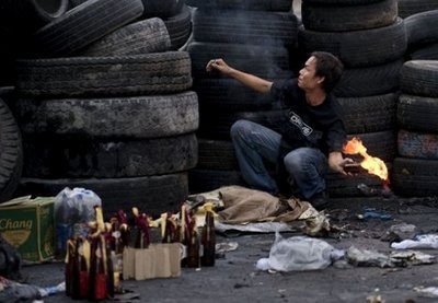 有“紅衫軍”成員將一輛油罐車駛至一個主要路口,并燃燒輪胎企圖引爆。目擊者說,除了商場和酒店林立的商業區外,市內另一處地區也發生流血事件。有三幢商業大廈著火焚燒。當局周一開始局部封鎖市內著名游客區蘇坤蔚路。