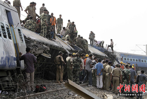 中新網(wǎng)5月28日電 綜合報(bào)道 當(dāng)?shù)貢r(shí)間28日凌晨1時(shí)30分,在印度東部西孟加拉邦西米德納布爾附近,一輛高速行駛的旅客列車遭襲致13節(jié)車廂脫軌,其中3節(jié)車廂又與對(duì)面駛來(lái)的貨運(yùn)列車相撞。目前為止,事故至少造成65人死亡,200多人受傷。