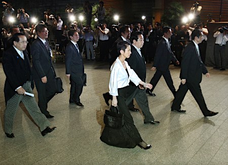 8日晚,日本天皇在天皇宮中舉行儀式,任命菅直人擔(dān)任日本新首相,同時一一任命了其它17名大臣。天皇對每一位大臣說:“肩負重責(zé),辛苦你了”。
