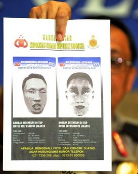 這兩張畫像是以在爆炸現場發現的兩顆遭嚴重損毀的頭顱為依據制作出來的。印尼警方發言人稱,“我們在爆炸地點發現了兩顆遭嚴重損毀的頭顱,而且我們肯定他們就是自殺式人彈的嫌疑人。”