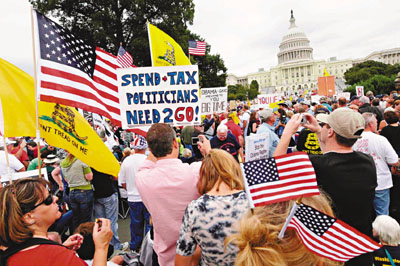 示威者逼爆賓夕法尼亞大道,連綿數(shù)個(gè)街區(qū),齊向國(guó)會(huì)山莊浩浩蕩蕩前進(jìn)。他們高舉奧巴馬和美國(guó)眾議院議長(zhǎng)佩洛西的肖像,以及寫滿“不要更多的開支,不要更多的稅收,不要更多的謊言”、“支持奧巴馬的醫(yī)療改革方案等于自殺”等各種各樣的標(biāo)語。