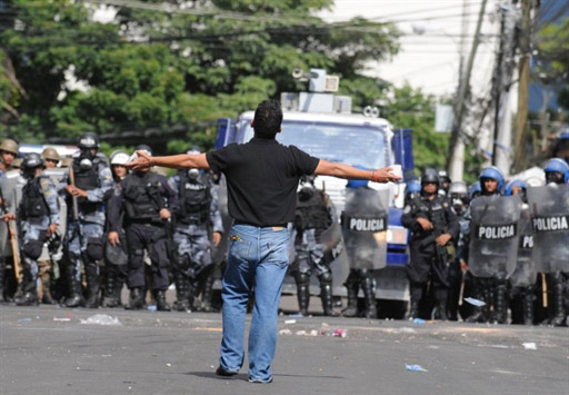 9月23日,在洪都拉斯首都特古西加爾巴,一名抗議者與警察對抗