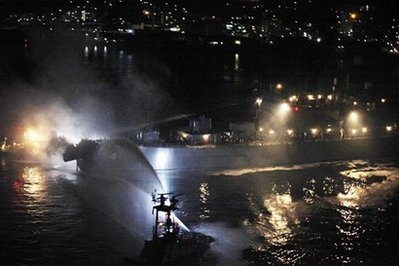 綜合此間報道,事發(fā)現(xiàn)場位于連接福岡縣北九州市與山口縣下關市兩市的關門橋正西約一公里的海面。兩船相撞后,KURAMA號的船頭和“CARINA STAR”號的集裝箱同時起火,火勢在半個多小時后得到控制,至少有三名自衛(wèi)隊成員在救火過程中受傷。