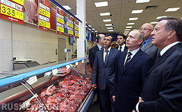 陪同普京前往“十字路口”超市連鎖店的有俄羅斯政府第一副總理祖布科夫和商界代表等。普京首先走到奶制品柜臺前,詢問了奶制品加價情況。科巴拉澤獲悉,超市中的奶制品平均加價10盧布出售,但他指出,“也有低于成本價出售的情況”。