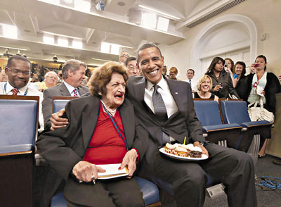 8月4日是奧巴馬48歲生日,也是赫斯特報(bào)系專欄作家湯馬斯的89歲生日。白宮首席發(fā)言人吉布斯在白宮新聞發(fā)布室內(nèi)進(jìn)行每日簡(jiǎn)報(bào),大批記者聚集向他提問,此時(shí),奧巴馬捧杯形蛋糕入內(nèi),帶領(lǐng)記者團(tuán)為湯馬斯唱生日歌。