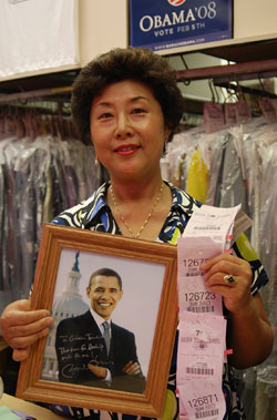 之前的30多年里,這家洗衣店是由另外一位韓國人經營,姜女士是在去年剛接手過來的。她表示:“聽之前的店主人說‘奧巴馬1992年和妻子米歇爾結婚后就成了我們店的?汀。即使在競選期間,他每周也送洗兩次衣服!闭f著,她還展示了奧巴馬的照片和他開出的回執。