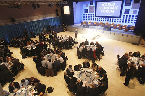 世界經(jīng)濟(jì)論壇年會(huì)舉行圓桌會(huì)議,政商領(lǐng)袖討論經(jīng)濟(jì)形勢(shì)。