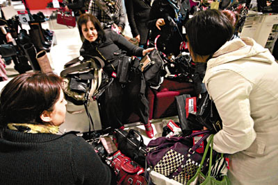 在伯明翰一購物中心,3位顧客在爭奪減價名牌手袋。