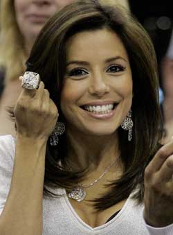 “絕望主婦”伊娃·朗格莉亞日前助陣丈夫托尼·帕克所屬馬刺隊和開拓者隊的NBA常規賽。場邊的她除了為老公充當拉拉隊外,還不時拿起托尼碩大的2007NBA總冠軍指環,朝著媒體鏡頭得意地大秀一番。